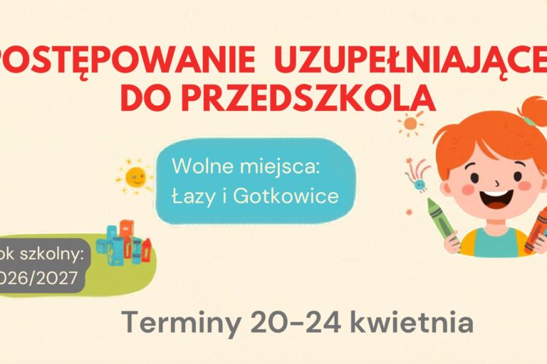 Dyrektor Zespołu Szkół w Jerzmanowicach informuje, że w dniach od 20 kwietnia do 24 kwietnia 2026 r. odbędzie się postępowanie uzupełniające do Przedszkola Samorządowego w Jerzmanowicach i oddziału przedszkolnego w Gotkowicach na rok szkolny 2026/2027.