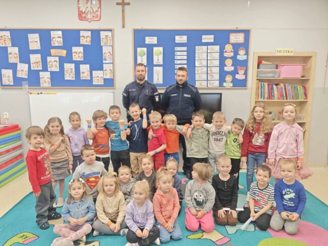 W piątek 23 stycznia 2026r. w przedszkolu odbyło się spotkanie przedszkolaków zfunkcjonariuszami Policji z Krzeszowic, którego celem było przybliżenie dzieciom zasad bezpieczeństwa,