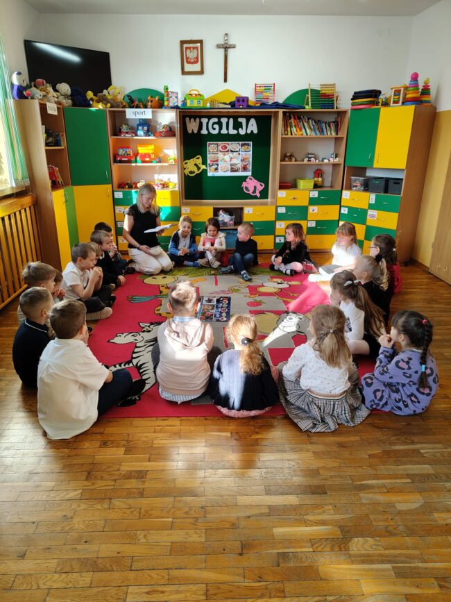 Wigilia w przedszkolu to uroczysty dzień pełen tradycji, integrujący dzieci i kadrę.W Łazach 19.12.2025r. przedszkolaki wspólnie z wychowawcami udekorowały piękniestoły. Rozmawialiśmy o tradycjach bożonarodzeniowych. W odświętnych strojachpodzieliliśmy się opłatkiem i składaliśmy sobie życzenia. Wspólnie śpiewaliśmy kolędy,pastorałki oraz usiedliśmy do uroczystego obiadu. To był dzień pełen serdecznych relacjimiędzy nami wszystkimi.