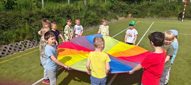 30.05.2025r. nasze przedszkolaki obchodziły radośnie Dzień Dziecka. Z tej okazjizorganizowaliśmy wspólne zabawy ruchowe na boisku szkolnym, które sprawiły dzieciommnóstwo radości i zapewniły aktywne spędzenie czasu na świeżym powietrzu.Jedną z głównych atrakcji był tor przeszkód, który wymagał od dzieci sprytu, równowagi szybkości. Przedszkolaki z zapałem pokonywały różnorodne przeszkody – przechodziłyprzez tunele, skakały przez płotki i czołgały…