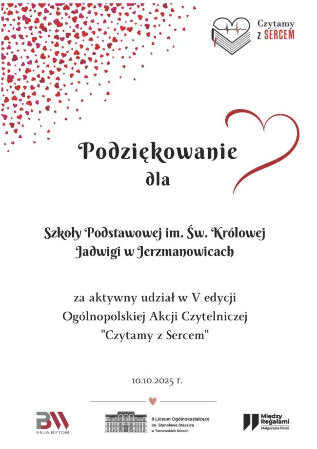 Nasz szkoła wzięła udział w Ogólnopolskiej Akcji „Czytamy z Sercem”.Głównym jej celem była promocja literatury i czytelnictwa oraz poszerzanie wiedzy uczestników na temat serca (jego budowy, symboliki, chorób, funkcji oraz propagowania zdrowego stylu życia). Otrzymaliśmy oficjalne podziękowania za aktywny udział.